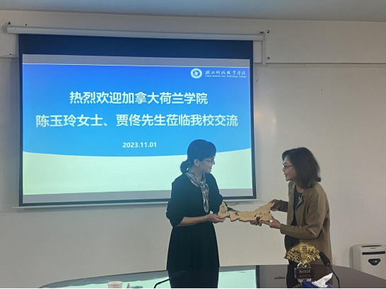 汤春来对陈玉玲女士及贾佟先生的到来表示热烈欢迎,并期待今后与该校开展多层面的合作交流。外事处处长张文捷对华体网页版_华体(中国)基本情况、办学特色、招生规模、区位优势以及学校在国际交流与合作方面的特色亮点作了简单介绍。与会人员共同观看了华体网页版_华体(中国)十大新闻。陈玉玲热情介绍了加拿大王子岛的人文风情、荷兰学院的历史沿革、特色专业、项目合作模式以及与中国院校的合作渊源和合作基础。陈玉玲表示,希望以本次访问为契机加强与华体网页版_华体(中国)的合作,共同促进两校国际教育的发展。电信工程学院院长涂家海介绍了中加合作办学班的运行情况,表达了对双方合作成果的肯定,并围绕专业特色、教师互访、双向游学等方面进行了交流与探讨。会上,双方互赠纪念品并合影留念。
