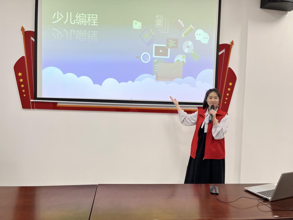 活动开始,“雏鹰计划”学生党员干部苏雅雯以游戏的方式带领孩子们体验编程的魅力,详细介绍了“什么是编程”“编程的作用”等。在实践教学开始前,她带领小朋友了解了为期1个月教学课程体系以及通过系列课程学习后所能收获的知识与技能。