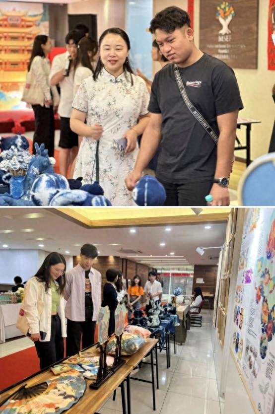 本展览的主题为“湖北在传承”,以湖北武汉名片——“天下江山第一楼”的黄鹤楼为载体,通过景泰蓝、扎染、剪纸三种艺术形式,分“字绘中国”“植物染撷”“荆楚岁时”“剪纸湖北”等四个板块予以展示,每一件参展作品都充满了匠心,既保留了荆楚文化的韵味,也诠释了荆楚文化的独特魅力,获得到场观众的一致好评。当马来亚大学的留学生看到用景泰蓝工艺制作的“字绘黄鹤楼”作品时,不禁赞叹到,在中国传统佳节中秋节来临前夕,能在异国他乡看到国内传统文化艺术制作的“天下江山第一楼”,有如身临其境“一杯浊酒同登黄鹤楼,欲问蝉娟明月可曾留”的景象。带着这份来自祖国文化熏陶的思念情感,马来亚大学的留学生们主动寻求与湖北开放大学教师合影,刘义书记也亲切的与留学生们互动交谈,并祝愿他们学业有成,期望他们为中马友谊、教育、文化交流做出贡献。