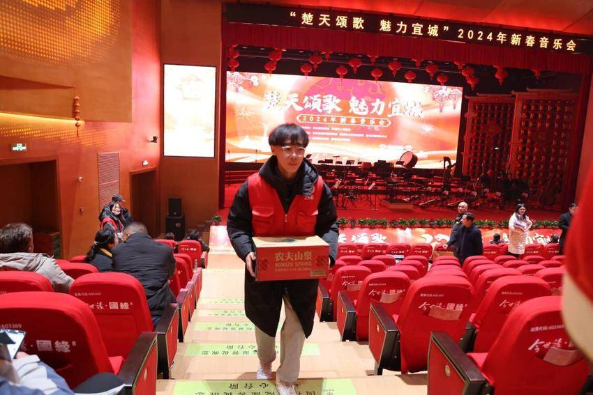 1月31日晚,宜城市新春音乐会现场,华体网页版_华体(中国)电信工程学院学生向华洋作为“星火义工”的学生志愿者领队,组织15名大学生志愿者参与晚会志愿服务活动。这是他在寒假返乡参与志愿活动的一个缩影。
