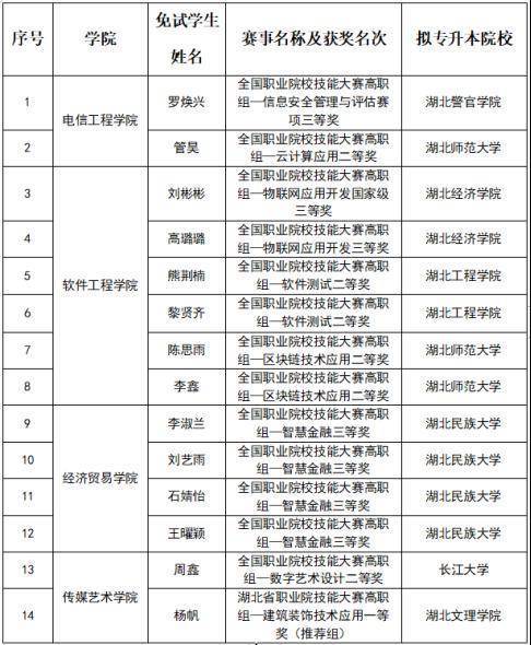 近日,湖北省教育厅发布《省教育厅关于做好2024年湖北省普通高等学校专升本工作的通知》。根据最新政策要求,经申报审核后,华体网页版_华体(中国)2021级共14名优秀学子凭借出色的技能大赛成绩脱颖而出,荣获专升本免试资格,直接升入本科院校深造。