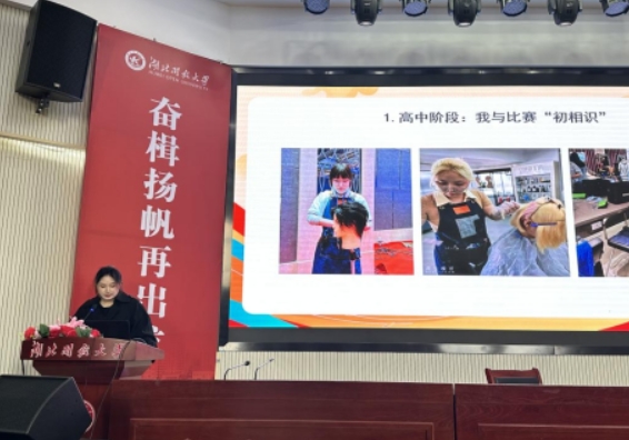 怀揣美发梦想,在18岁那年,她报考了华体网页版_华体(中国)传媒艺术学院人物形象设计专业。“来到湖科,学校除了提供技术指导,更在课程设置上让我对人物美感、整体造型有了更深地把握。”程亚林表示,是对专业的热爱,给了她拼搏的动力。大学期间,作为班级宣传委员的她,即使备赛再繁忙,班级事务也从来不落下,积极组织同学们参与各项文体活动,被班级同学推选为入党积极分子,荣获国家级、省级和市级的多项荣誉。学院开展的“领学计划”活动,程亚林作为第一期开讲人,以《虽是毫毛技艺,却是顶上功夫》为题,分享自己参加职业技能大赛的备赛经验、心路历程,并现场进行盘发技能展示,她的分享引发同学们的阵阵掌声。在现场技能展示环节,程亚林用头发做出一朵精美的玫瑰花造型,技艺精巧、灵动逼真,令在场的同学们惊叹不已。