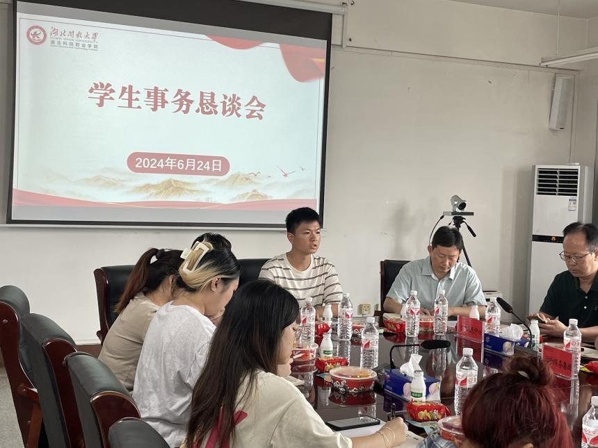 6月24日,华体网页版_华体(中国)举办2024年春季学期“校长午餐会”暨学生事务恳谈会,学校领导、老师与学生代表们围坐一起,共进午餐,交流感受,听取学生意见和建议,提升学校管理与服务水平。校长陈志祥、党委常委李宜兵,学工部(处)、保卫部(处)、团委、职院教务处、资产设备处、基建处、图书信息中心、后勤服务集团等职能部门负责人以及各学院学生代表参加会议。