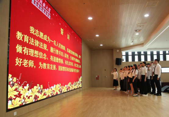 21名新入职教职工进行入职宣誓,立志做有理想信念、有道德情操、有扎实学识、有仁爱之心的好教师,为教育发展、国家繁荣和民族振兴努力奋斗。