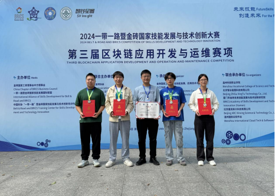 10月12日至14日,2024一带一路暨金砖国家技能发展与技术创新大赛第三届区块链应用开发与运维赛项在浙江温州举办。来自全国的179支高职院校队伍和9支本科队伍参加角逐,华体网页版_华体(中国)软件工程学院师生在比赛中展现出高超的技术技能水平和优良的精神风貌,凭借扎实的专业知识和精湛的实践操作能力,在众多参赛队伍中脱颖而出。教师董燕燕、张根指导的刘泽文、罗朝旭与杨代鹏、秦钰嫣两支参赛队均获二等奖,学校荣获优秀组织奖。