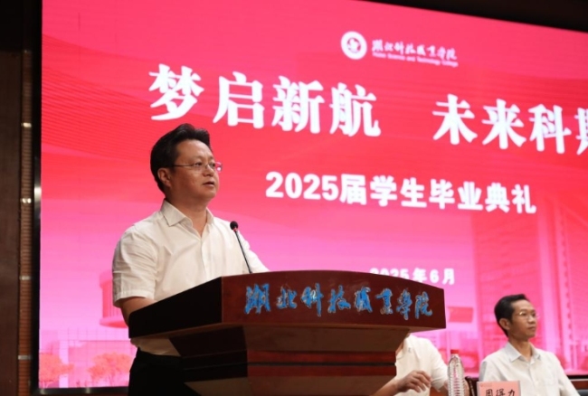 工商管理学院人力资源管理专业孙彬彬作为优秀毕业生代表发言。他回顾三年来在湖科的成长历程,从专业成绩中游到荣获国家奖学金,从省级选拔赛第一到世界职业院校技能大赛摘银,他用“知不足而奋进,望远山而前行”激励学弟学妹们不断突破自己、勇敢追梦,创造属于自己的辉煌,并深情告白学校:“湖科育我,我爱湖科。”