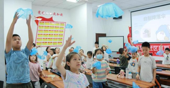 多元课程:在体验中解锁成长的N种可能。除了非遗课程与少儿编程,托管班的课程表还藏着“美育”与“责任”的密码:音乐课上,志愿者邓嘉译通过小游戏教孩子们识谱,教唱《稻香》等歌曲,让社区活动中心成了“小演唱会”;环保课走出教室,孩子们用树叶制作环保宣传海报,化身小小志愿者,在社区花园开展“洁净家园”志愿服务活动;科学实验课中,孩子们用垃圾袋自制降落伞,在记录单上写下“伞面越大,空气阻力越大,下落越慢!”的实验结论,连平时坐不住的“小调皮”都专注得像个小科学家。