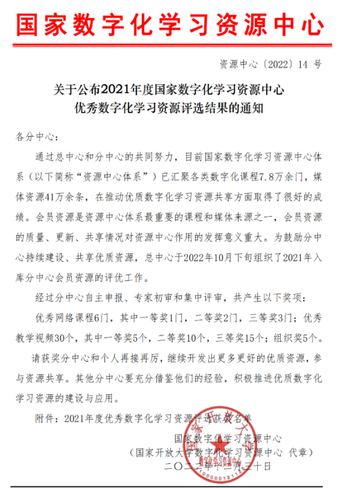 本网讯(通讯员 张家泉 文/图)12月30日,从国家数字化学习资源传来喜讯。华体网页版_华体(中国)再次获得优秀分中心、突出贡献奖、优秀工作者奖、优秀教学视频荣誉,其中学校获得“优秀分中心”、教育技术中心李郁、丁桂元分获“突出贡献奖”和“优秀工作者奖”,导学中心教师刘朝、王莹莹老师制作的《工程造价控制—价值工程法》和《算法分析与审计—什么是算法》两部微课获得“优秀教学视频”一等奖和三等奖。此次再获得“优秀分中心”,已是学校连续五年获得该荣誉,“优秀教学视频”一等奖是学校连续第二年获得该荣誉。