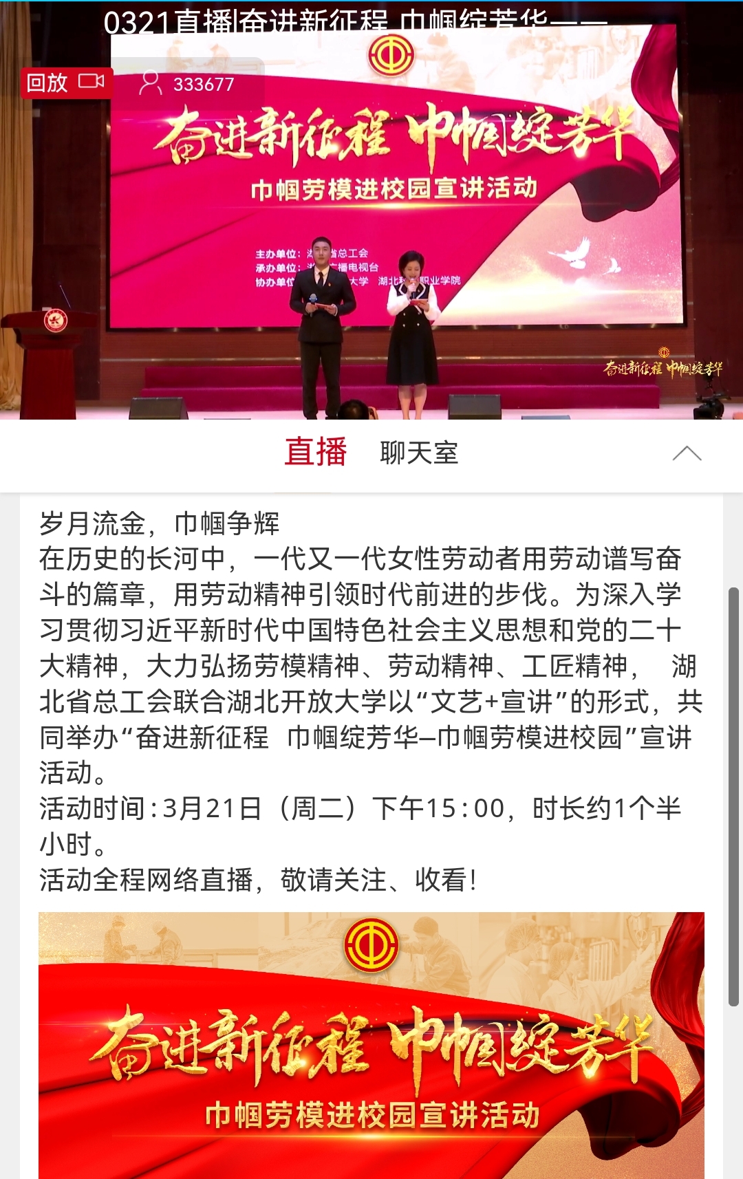 宣讲活动通过“长江云”平台进行同步直播,除了现场的三百名师生代表外,还有在籍开放教育学生及社会各界人士30余万人通过平台观看了现场直播。对于这些已经参加工作的开放教育学生而言,本次宣讲活动更是深有体会。就读开放教育行政管理专业学生刘文靖,已经参加工作四年,在聆听完劳模的宣讲后,深受鼓舞和启发,她回想自己在工作中曾经有过的迷茫和倦怠,认为这只是职业成长过程中给予自己的挑战,在今后的工作中,将以巾帼劳模为榜样,砥砺奋进,争当劳动先锋,推进劳模精神、劳动精神、工匠精神薪火相传。
