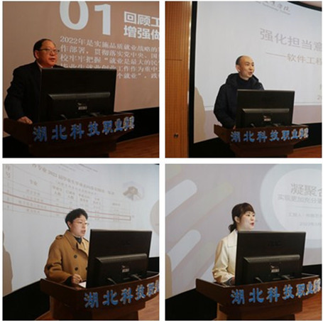 会上,招生就业处处长赵天武以《守正创新接续奋进 用心用情用力做好2023年就业创业工作》为题,回顾了疫情三年以来就业创业工作进展情况,肯定成绩、总结经验、分析形势、查摆不足,汇报了学校近期就业创业工作情况和下一步工作打算。学校表彰了2022年度就业创业工作先进集体、就业创业质量优质专业和就业创业工作先进个人。软件工程学院党总支书记郝锐、电子信息工程技术专业教师李珈和传媒艺术学院学工办主任谭芬分别代表先进集体、优质专业、先进个人发言,并进行了分享与交流。