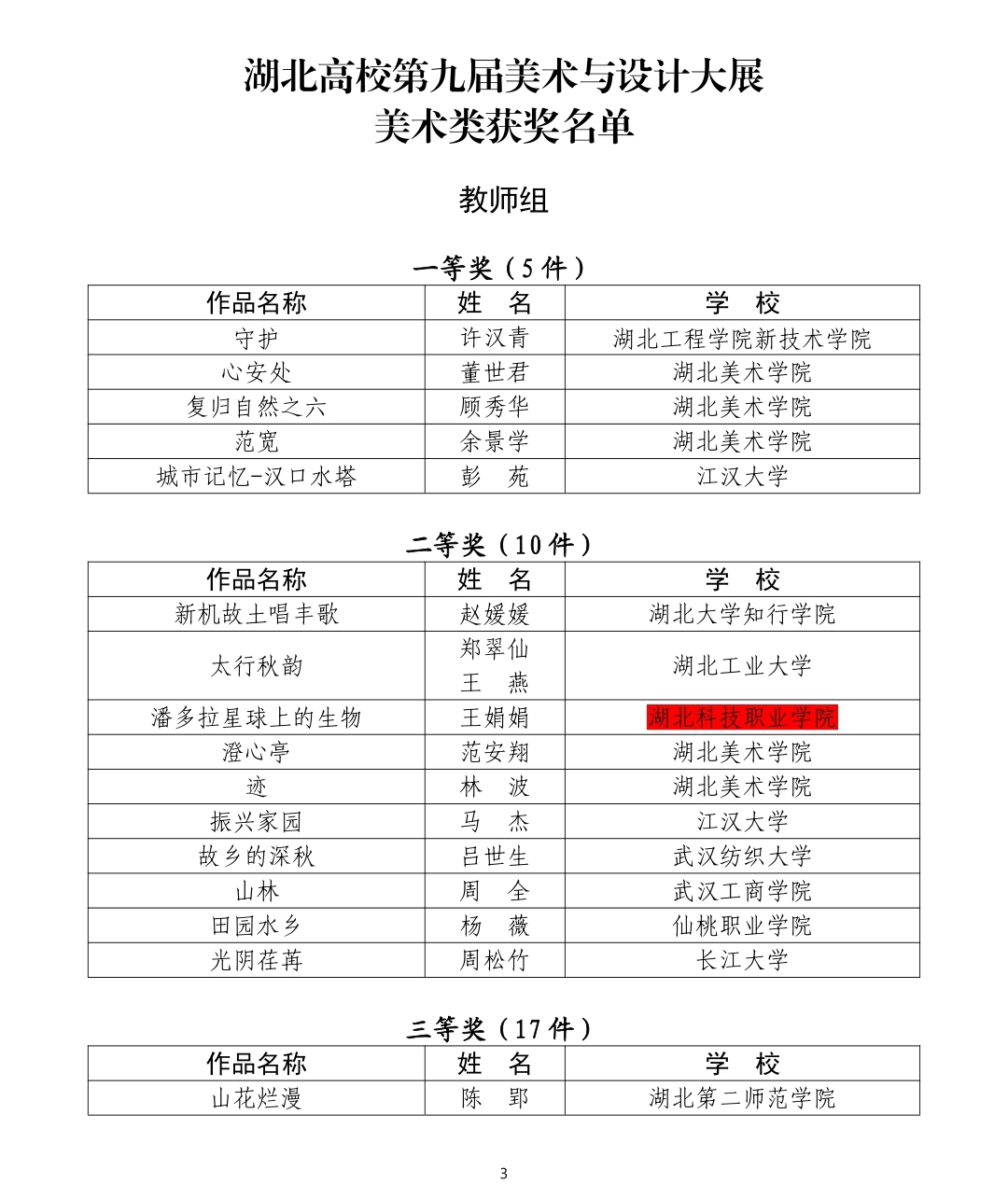 据悉,本届高校美展收到来自全省高校组织报送的师生美术、设计、摄影作品近6800余件,覆盖面广,参与度高,代表了全省高校师生的创作水准,体现了湖北省美术和设计高等教育的蓬勃发展。经各高校报送、专家初评、复评、公示,共评选出美术类获奖作品242件,设计类获奖作品260件,摄影类获奖作品143件。