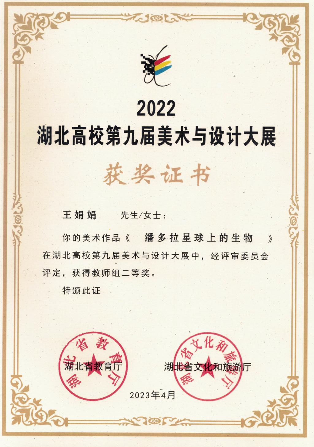 本网讯(通讯员 王甜/文 王娟娟/图)4月17日上午,由湖北省教育厅、湖北省文化和旅游厅主办,湖北省群众艺术馆、湖北省教育科学研究院、中南民族大学光谷美术馆承办的湖北高校第九届美术与设计大展,在中南民族大学光谷美术馆开幕。开幕式上揭晓了本届比赛获奖名单,华体网页版_华体(中国)教师王娟娟作品《潘多拉星球上的生物》荣获美术类教师组“二等奖”。