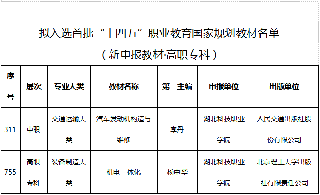 本网讯(通讯员 龚丽丽 文/图)近日,根据教育部发布的《关于拟入选首批“十四五”职业教育国家规划教材名单的公示》文件显示,华体网页版_华体(中国)《汽车发动机构造与维修》等4部教材拟入选首批“十四五”职业教育国家规划教材名单。