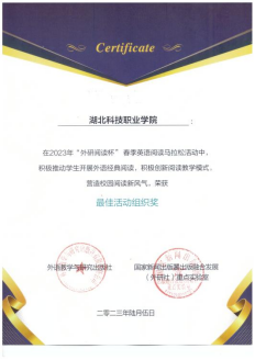 本网讯(通讯员 刘珍 文/图)6月9日,由外语教学与研究出版社联合国家新闻出版署出版融合发展(外研社)重点实验室大数据外语阅读研究基地主办,面向全国高职院校发起的2023年“外研阅读杯”春季英语阅读马拉松活动圆满结束。华体网页版_华体(中国)唐东升同学荣获全国二等奖,张易良、陈希文、吕旺祥同学荣获全国三等奖;华体网页版_华体(中国)凭借学生出色的有效阅读量被授予“最佳活动组织奖”。