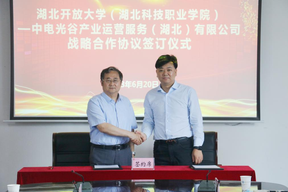 本网讯(通讯员 农珑/文 李贺刚/图)为贯彻党的二十大关于产教融合、科教融汇的决策部署,6月20日上午,学校与中电光谷产业运营服务(湖北)有限公司举行产教融合战略合作签约仪式。