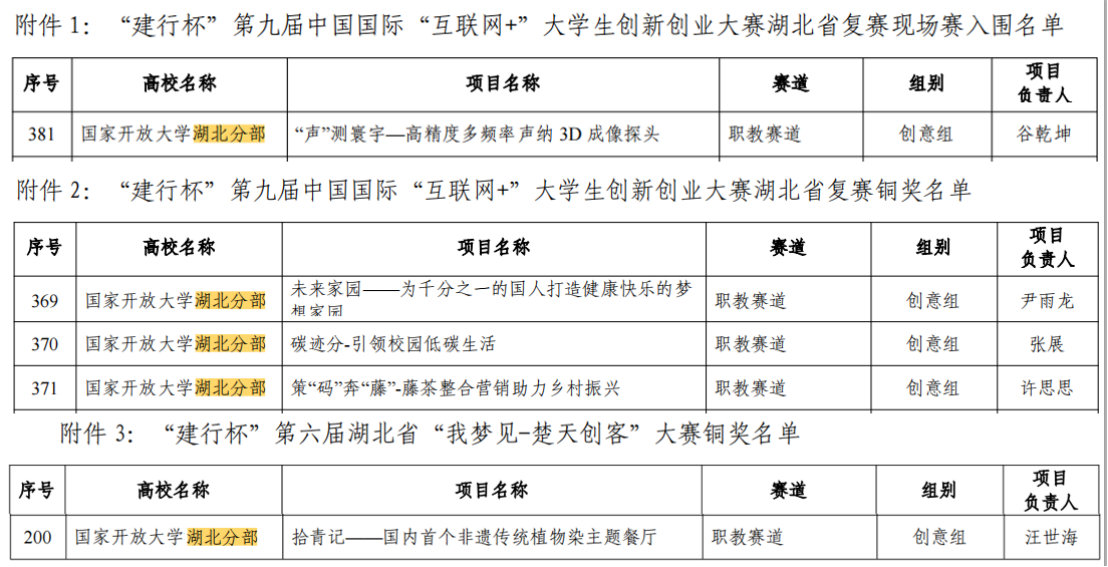 近年来,学校高度重视教学中心地位、持续深化实践教学改革、突出创新创业教育的成果,全省办学体系凝心聚力、落实学历教育“创优提质”战略,积极构建和打造具有湖北开放教育特色的创新创业教育体系,以“互联网+”大学生创新创业大赛等竞赛和项目为驱动,培养学生创新创业能力,催生创新创业成果方面成效显著。