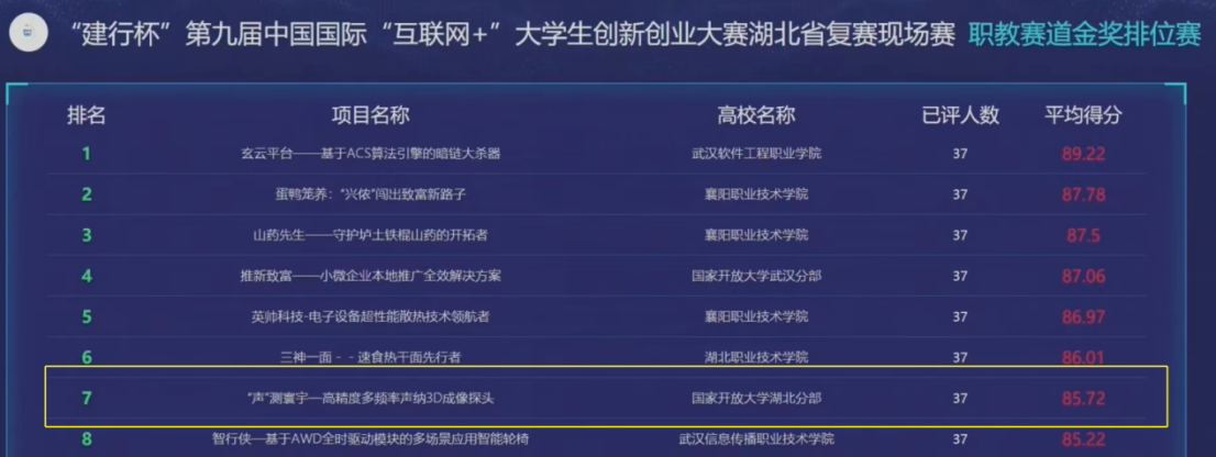 “建行杯”第九届中国国际“互联网+”大学生创新创业大赛湖北省复赛由湖北省教育厅主办,今年的参赛规模和项目种类再创历史新高,全省共有9.75万个项目,43.06万名大中专学生报名参赛。在各校初赛基础上,对4083个项目的网络评审,评选出997个奖项,遴选出109所高校的407支队伍争夺金奖。
