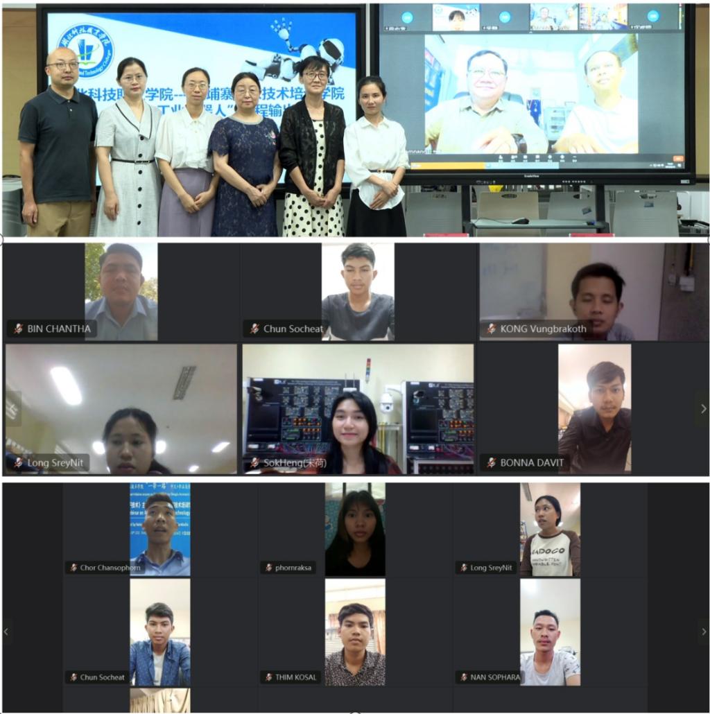 本网讯(通讯员 沈文捷 严翩/文 沈文捷 陶丽梅 李郁 詹昊/图)8月10日至16日,华体网页版_华体(中国)对柬埔寨国家技术培训学院开展“中文+工业机器人”课程输出项目。课程输出开班仪式在10日举行,副校长汤春来教授、外事处、机电工程学院相关负责人、学校国家级职业教育教师教学创新团队(工业机器人技术)立项建设单位负责人和团队成员出席了仪式。柬埔寨国家技术培训学院副校长潘纳瑞恩、相关部门负责人以及师生在线出席了仪式。