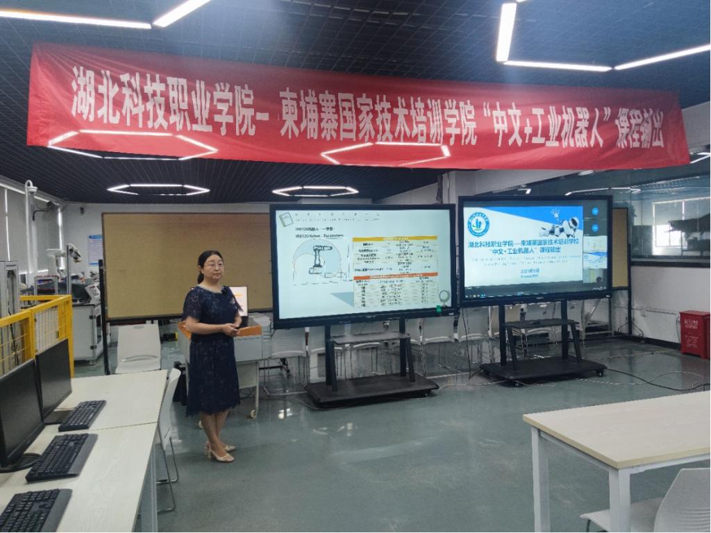 开班仪式结束后,为期7天的“中文+工业机器人”课程输出课程正式开始。学校国家级职业教育教师教学创新团队(工业机器人技术)立项建设单位负责人於红梅教授开展了《工业机器人操作与编程》的第一次对外课程教学,通过视频的方式向柬埔寨师生展示了武汉的人文地理和精神风貌,介绍了华体网页版_华体(中国)的校园和师生风采。通过视频演示、ppt讲授和实训室设备硬件平台展示的方式让学生们了解工业机器人的发展和应用,认识ABB地面工作站的结构组成,掌握ABB机器人的系统功能,为后续课程打下基础。