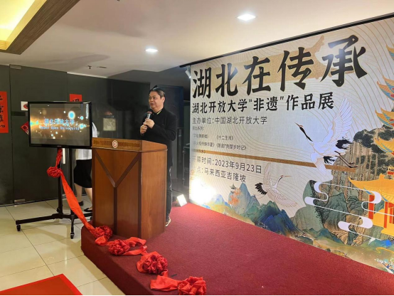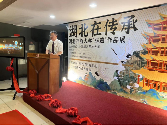 开幕式上,刘义在致辞中表示:中国和马来西亚是隔海相望的邻居,传统友谊跨越千年,文化是两国人民交流与友谊的桥梁。举办本次非物质文化遗产作品展,旨在进一步加强中马在文化、教育领域的交流与合作,助力共建“一带一路”,期盼双方在未来共促共进、互学互鉴、同向同行。拿督林恒毅先生对湖北开放大学一行的到来表示欢迎,他表示,本次作品展将为马来西亚带来湖北荆楚文化,代表着马中两国秉承“各美其美、美美与共”的共赢共享文化发展理念,不断开创马中特色文化教育的新局面。