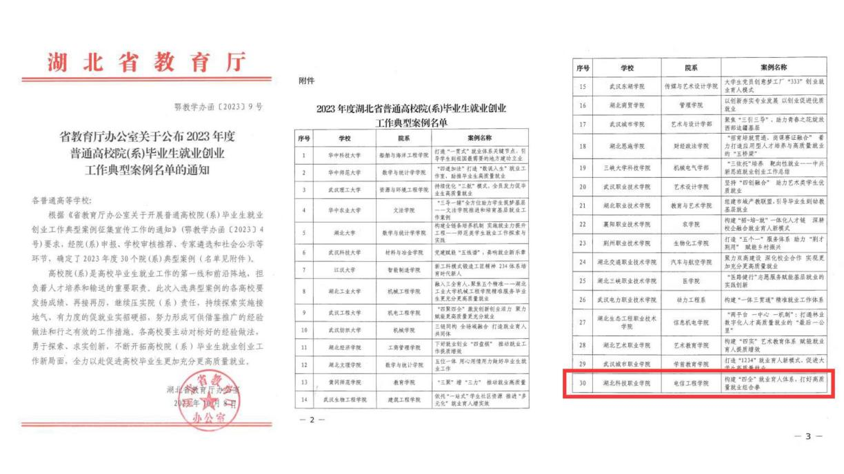 本网讯(通讯员 王东瑾 向珅玓 文/图)10月8日,湖北省教育厅办公室下发《关于公布2023年度普通高校院(系)毕业生就业创业工作典型案例名单的通知》(鄂教学办函〔2023〕9号),华体网页版_华体(中国)电信工程学院申报的案例《构建“四全”就业育人体系,打好高质量就业组合拳》入选,成为入选的30个高校院(系)典型案例之一,11家高职院(系)之一。