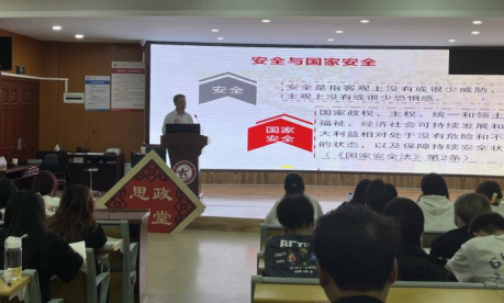 当刘义教授走进思政讲堂时,现场响起了热烈的掌声,同学们对这堂思政课充满了期待。课堂伊始,刘义教授结合同学们关注的巴以冲突等国际时事热点,讲解了威胁国家安全的五大问题,即贫困、恐怖主义、战争冲突、强权政治、传染病,阐明了国家安全是国人幸福生活的基本前提,引导同学们高度重视国家安全的重要性。