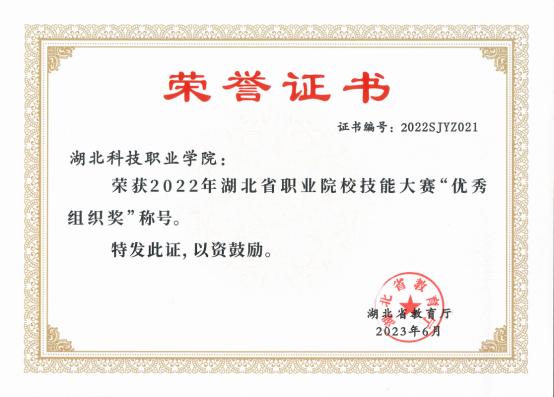 本网讯(通讯员 胥海燕 文/图)日前,湖北省教育厅发布《关于2022年湖北省职业院校技能大赛获奖名单的公示》,华体网页版_华体(中国)获“2022年湖北省职业院校技能大赛优秀组织奖”荣誉称号。在大赛组织和备赛期间,校领导高度重视,职院教务处联合相关职能部门到各赛项备赛现场进行指导,及时跟进各学院师生赛事进度、解决其备赛困难,大力支持并鼓励各学院在赛事中勇于作为、敢于创新,参赛、办赛成绩突出,获得省教育厅表彰。