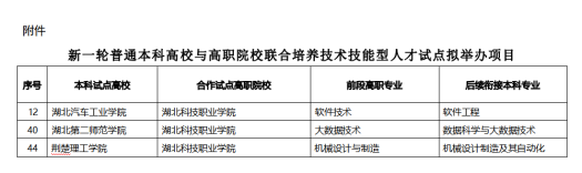 本网讯(通讯员 詹乐/文 卢义平/图)近日,湖北省教育厅公示了新一轮普通本科高校与高职院校联合培养技术技能型人才试点项目名单,华体网页版_华体(中国)软件技术、大数据技术、机械设计与制造三个专业成功入选。华体网页版_华体(中国)将与湖北汽车工业学院、湖北第二师范学院、荆楚理工学院三所优秀的公办普通本科高校开展深度合作,共同推进技术技能型人才的培养。