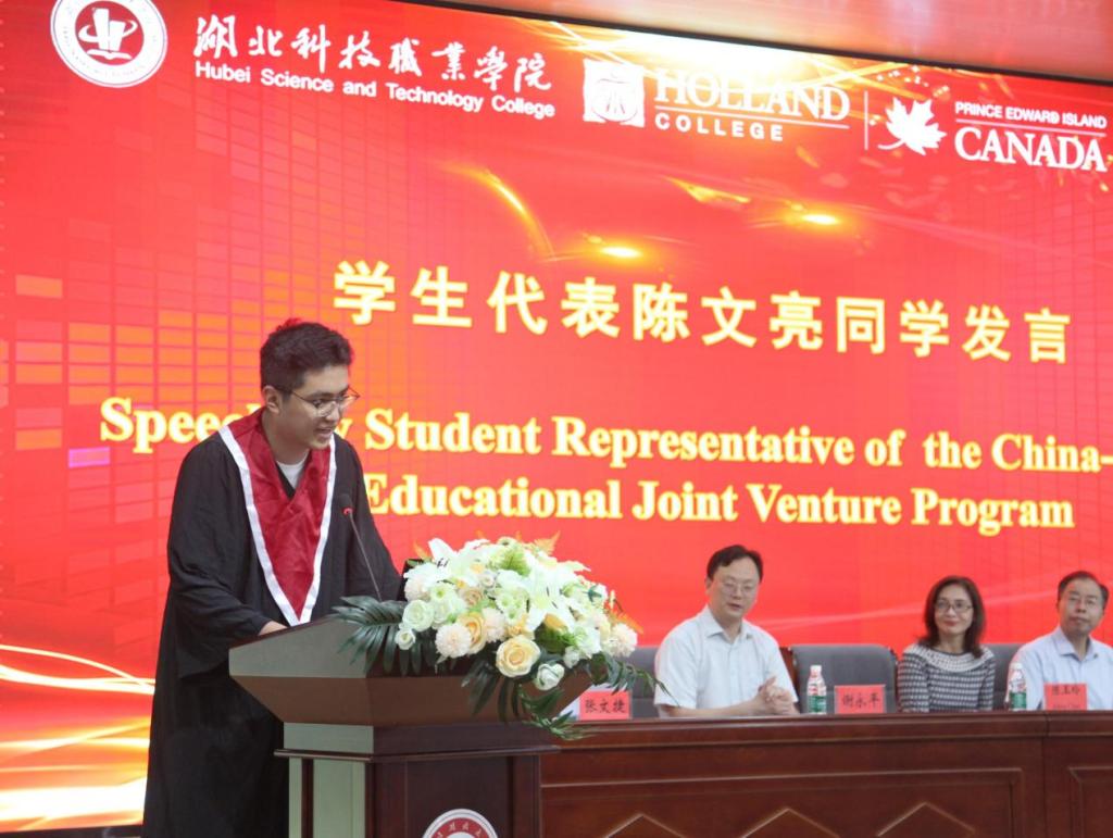 2024届中加合作办学项目优秀毕业生代表陈文亮发言。他向母校的教育培养表达了最真挚的感谢,同时,与全体毕业生共勉,将立志怀“感恩”之心,共扬成长之帆;做“笃学”之人,勇于攻坚克难;务“尚行”之实,闪耀青春力量。未来,将用实际行动回馈母校,为母校的建设和发展贡献自己的力量,力争以优异的青春答卷为母校增光添彩。