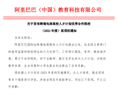 本网讯(通讯员 秦琴 文/图)近日,华体网页版_华体(中国)在推动教育部供需对接就业育人项目及阿里巴巴国际站数字贸易产业学院建设中取得显著成果,荣获阿里巴巴(中国)教育科技有限公司跨境电商高校人才计划中的“跨境电商人才就业促进优秀组织奖”。这一成就标志着华体网页版_华体(中国)工商管理学院在跨境电商教育领域的影响力和教育质量得到业界的高度认可。