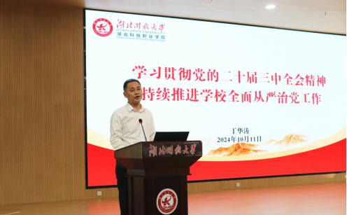 丁华涛作《学习贯彻党的二十届三中全会 精神持续推进学校全面从严治党工作》辅导报告。丁华涛从党的二十届三中全会公报中关于“在进一步全面深化改革中健全全面从严治党体系”这一论述入手,围绕全面从严治党的历史逻辑、全面从严治党面临的形势和取得成绩、落实党的二十届三中全会精神为学校高质量发展提供有力保障三个方面进行了深刻论述。他认为,要坚定不移增强全面从严治党的政治自觉,在形成全面从严治党合力上下功夫求实效、在学明白、想清楚上下功夫求实效、在强化政治监督上下功夫求实效、在一体推进“三不”上下功夫求实效、在纪律作风建设上下功夫求实效、在建设忠诚干净担当的纪检监察铁军上下功夫求实效,准确把握“严”的主基调、“严”的新常态、“严”的新要求,把全面从严治党贯穿办学治校全过程,校纪委将把监督的重点放在督责任、督落实、督作风上来,为学校改革发展清障护航。