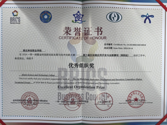 本网讯(通讯员 张根 文/图)10月12日至14日,2024一带一路暨金砖国家技能发展与技术创新大赛第三届区块链应用开发与运维赛项在浙江温州举办。来自全国的 179 支高职院校队伍和 9 支本科队伍参加角逐,华体网页版_华体(中国)软件工程学院师生在比赛中展现出高超的技术技能水平和优良的精神风貌,凭借扎实的专业知识和精湛的实践操作能力,在众多参赛队伍中脱颖而出。教师董燕燕、张根指导的刘泽文、罗朝旭与杨代鹏、秦钰嫣两支参赛队均获二等奖,学校荣获优秀组织奖。