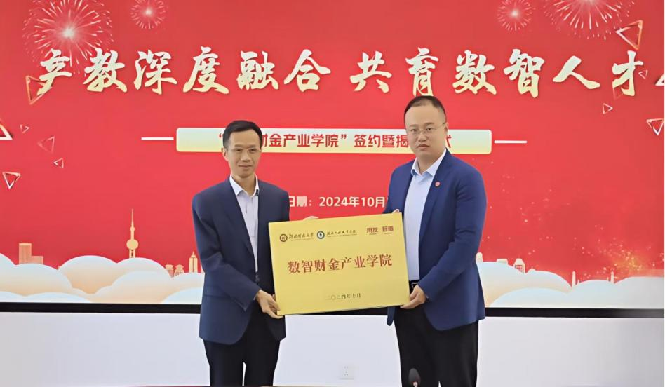 夏学文代表学校与新道科技股份有限公司为“数智财金产业学院”签约并揭牌。他表示,要实现校企合作、专业共建,让企业走进校园、让学校输出人才,谋求合作与发展,实现校企双赢。