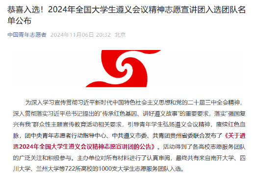 全国大学生遵义会议精神志愿宣讲团是为深入学习宣传贯彻习近平新时代中国特色社会主义思想和党的二十届三中全会精神,深入贯彻落实习近平总书记提出的“传承红色基因、讲好遵义故事”的重要要求,落实“强国复兴有我”群众性主题宣传教育活动相关要求,引导青年学生弘扬遵义会议精神,赓续红色血脉开展的遴选活动。此次活动得到了各高校志愿服务团队的广泛关注和积极参与。主办单位对所有材料进行了认真审阅,最终来自南开大学、四川大学、兰州大学等722所高校的1000支大学生志愿服务团队入选。