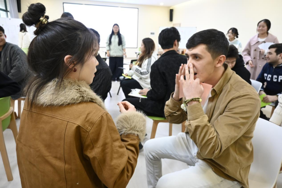 在心理健康教育中心,中外学生们共同开展了一场跨文化人际互动团体辅导活动,同学们绘制自画像并相互介绍了自己,拉近了彼此的距离。在“沟通接力”游戏中,中外学生们跨越语言障碍,凭借丰富的肢体表达和敏锐的观察力,成功完成了信息传递。他们表示,尽管大家国籍、语言和生活习惯大不相同,但彼此之间仍存在许多共同点,初次见面就像老朋友一样。在大学生活动中心,华体网页版_华体(中国)学子为国际学生们带来了琴棋书画、歌舞展示、汉服表演、国球交流等丰富多彩的活动,中外学子青春洋溢、汇聚一堂、深入交流、其乐融融。中国学生和中亚学生们一起载歌载舞、写书法、学剪纸、切磋乒乓球,来自乌兹别克斯坦的G.A.D还主动上台演唱了家乡的歌曲。通过这种形式的文化交流,中外学生们增进了了解和友谊,在欢声笑语中进行了更深层次的互动。