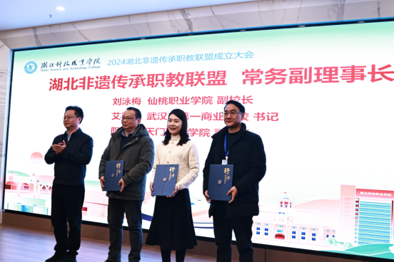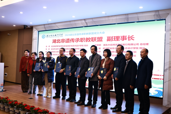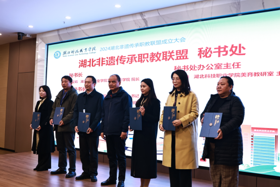 大会审议通过了《湖北非遗传承职教联盟章程(草案)》及第一届组织机构候选人名单,并为理事长、常务理事长、副理事长等颁发聘书。