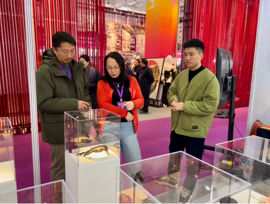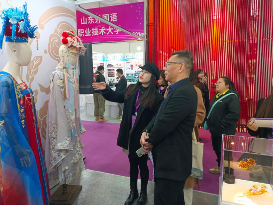 艺术创意学院人物形象设计专业教师向参观者介绍非遗饰品设计展览作品