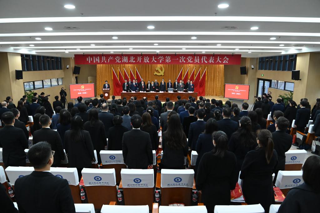 报告厅内气氛庄严热烈。主席台上方悬挂着“中国共产党湖北开放大学第一次党员代表大会”的会标,后幕正中是镰刀和锤头组成的党徽,10面鲜艳的红旗分列两侧,会场后方悬挂着“深化改革创新 加快融合发展 奋力谱写特色鲜明优势突出新型大学建设新篇章”的横幅。