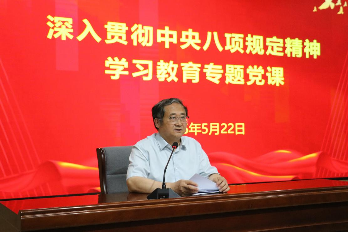 本网讯(通讯员 肖凌瑶/文 李贺刚/图)为深入学习贯彻习近平总书记关于加强党的作风建设的重要论述,扎实推进深入贯彻中央八项规定精神学习教育走深走实,5月22日,校党委书记钟毓宁讲授《贯彻落实中央八项规定精神 以作风建设实绩实效推动学校事业高质量发展》专题党课。全体校领导、中层领导干部及教师代表110余人参加,党课由校纪委书记丁华涛主持。