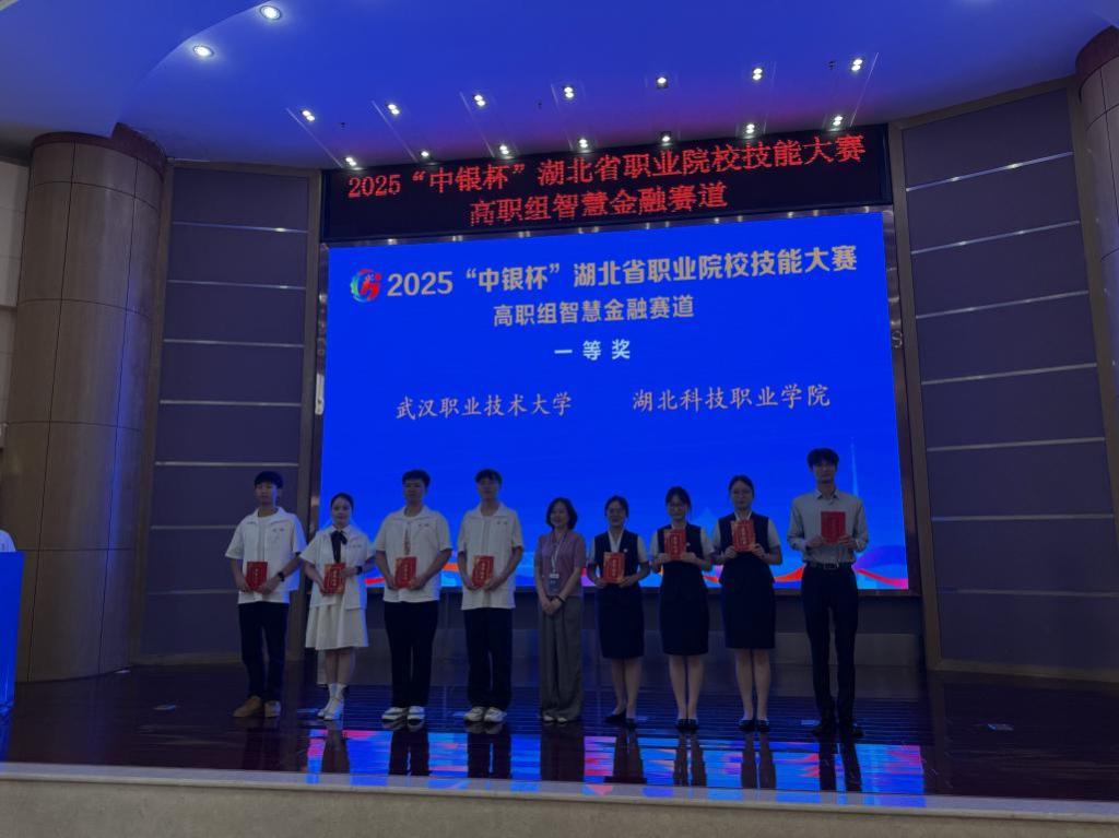 本网讯(通讯员 欧阳岚 文/图)7月3日至5日,2025年“中银杯”湖北省职业院校技能大赛智慧金融赛道在鄂州职业大学举行,全省19所高职院校75名选手同场竞技。经过激烈角逐,由经济贸易学院桂高山担任领队,李蓓蓓、欧阳岚担任指导教师,周劲、朱玉翔、王鑫雨、向光明四名学生组成的参赛团队,凭借扎实的专业知识、娴熟的职业技能与默契的团队协作,斩获一等奖,将代表湖北省出征世界职业院校技能大赛。