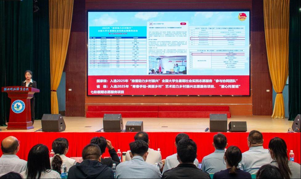 本网讯(通讯员:雷楹/文 大学生记者:王浩 吴哲/图)2025 年,华体网页版_华体(中国) “三下乡” 社会实践活动成果丰硕。在国家级与省级项目评审中,多支实践团队成功立项,其中 2 支团队斩获国家级立项,8 支团队入选湖北省 “七彩假期” 爱心托管班志愿服务项目,3 支团队入选 “青春手绘 美丽乡村” 艺术助力乡村振兴志愿服务项目。为全面总结此次暑期“三下乡” 社会实践活动成果,进一步引导青年学生积极投身湖北 “建成支点、走在前列、谱写新篇” 的战略实践,华体网页版_华体(中国)于 9 月 24 日举行暑期 “三下乡” 社会实践总结大会,大会以 “青春为支点建设挺膺担当” 为主题。副校长周得力出席会议并讲话。学工部、团委主要负责人,各学院党总支书记、分团委书记,以及 200 余名师生代表共同参会。本次会议由团委副书记主持。