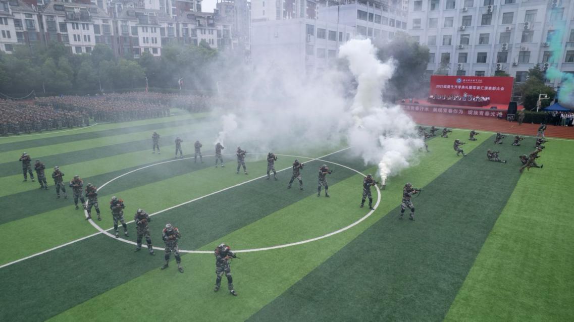 随后,军训汇演正式开始。在激昂的旋律中,特色方阵依次登场,以饱满的精神状态展现14天军训的丰硕成果。匕首操方阵动作刚劲有力,寒光闪烁间尽显巾帼风采。她们手持短刃,一招一式刚柔并济,展现出别样的飒爽英姿。擒敌拳方阵步伐沉稳铿锵,拳影翻飞间尽显青春担当。他们足踏实地,一拳一腿刚猛凌厉,展现出热血的昂扬姿态。“战术对抗”表演更是将现场气氛推向高潮,新生们模拟实战场景,卧倒、匍匐、冲锋,每一个动作都精准到位,充分展现了顽强的意志品质和过硬的纪律作风。