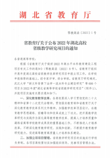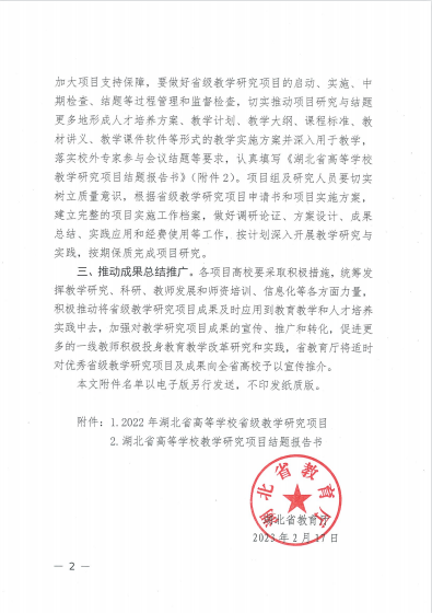 本网讯(通讯员 詹乐 文/图)2月11日,省教育厅公布了2022年度湖北省教学研究项目名单,华体网页版_华体(中国)推荐申报的2022年湖北高校省级教学研究项目获批立项2项:机电工程学院教师付强《高职石油工程专业课程思政教学实践与创新路径研究》、工商管理学院教师李智《“乡村振兴”背景下湖北高职院校专业结构优化调整的路径与策略》。
