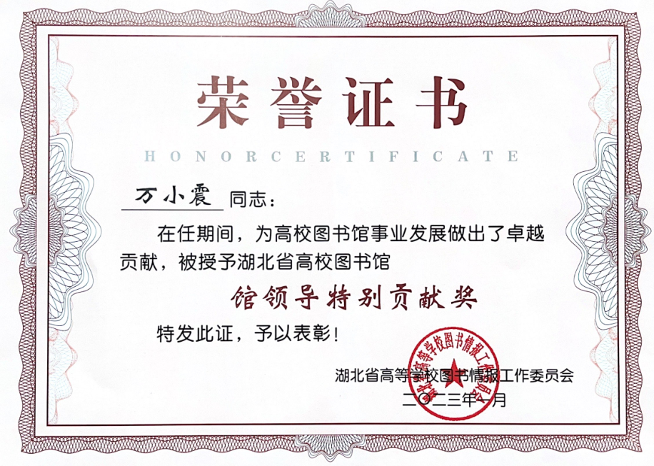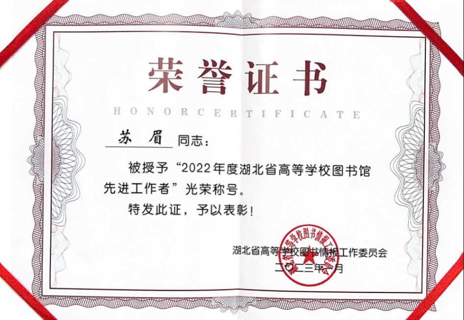 本网讯(通讯员 苏眉 文/图)近日,湖北省高等学校图书情报工作委员会在湖北咸宁组织召开“2023年湖北省高校图书馆馆长工作研讨会”。会议期间对获奖图书馆进行了表彰,华体网页版_华体(中国)图书信息中心主任万小震荣获 “馆领导特别贡献奖”,馆员苏眉荣获“2022年度湖北省高等学校图书馆先进工作者”光荣称号。