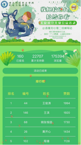 学生们参与活动的热情积极高涨,经过一周的评比和统计,本次活动共计收到全校范围内160余名选手作品,总浏览量达到17.5万余次。有学生表示,“自己也曾是留守儿童,也曾对外界美好的校园生活充满向往,能够以这样的方式传递关爱真是深入心底。希望学校能够多举行类似活动,让留守儿童感受到更多的鼓励和希望,看到更美好的人生和未来。”