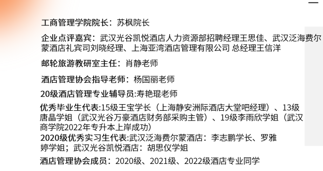 本网讯(通讯员 杨国丽/文 唐依婷/图)3月10日晚,工商管理学院酒店管理专业协会通过腾讯会议平台召开了优秀毕业生和实习生经验分享会。学院院长苏枫、上海亚湾酒店管理有限公司人才发展部总监谢珊、武汉泛海费尔蒙酒礼宾部刘经理、武汉光谷凯悦酒店人力资源部培训经理王经理、三名2020级优秀实习生以及2018届优秀毕业生上海静安洲际酒店大堂吧经理王宝、2016届优秀毕业生武汉光谷万豪酒店财务部采购主管唐晶、2022年专升本成功上岸武汉商学院李雨欣以及酒店管理专业协会指导老师、辅导员参加会议。