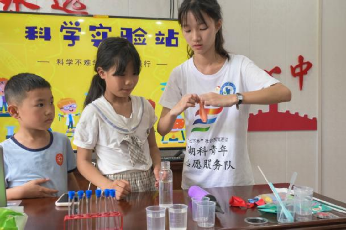 “科技强国我来讲,科学实验在行动”课堂。志愿者通过引用我国航天事业的成就带领乡村儿童感悟国家在科技上的伟大举措。同时将科学实验带到课堂上,让孩子们通过自己动手制作科学小发明,进一步培养他们的团队协作意识、动手操作能力和主动创新品质,激发乡村儿童学习科学知识的热情,为培养创新型人才打下良好基础。