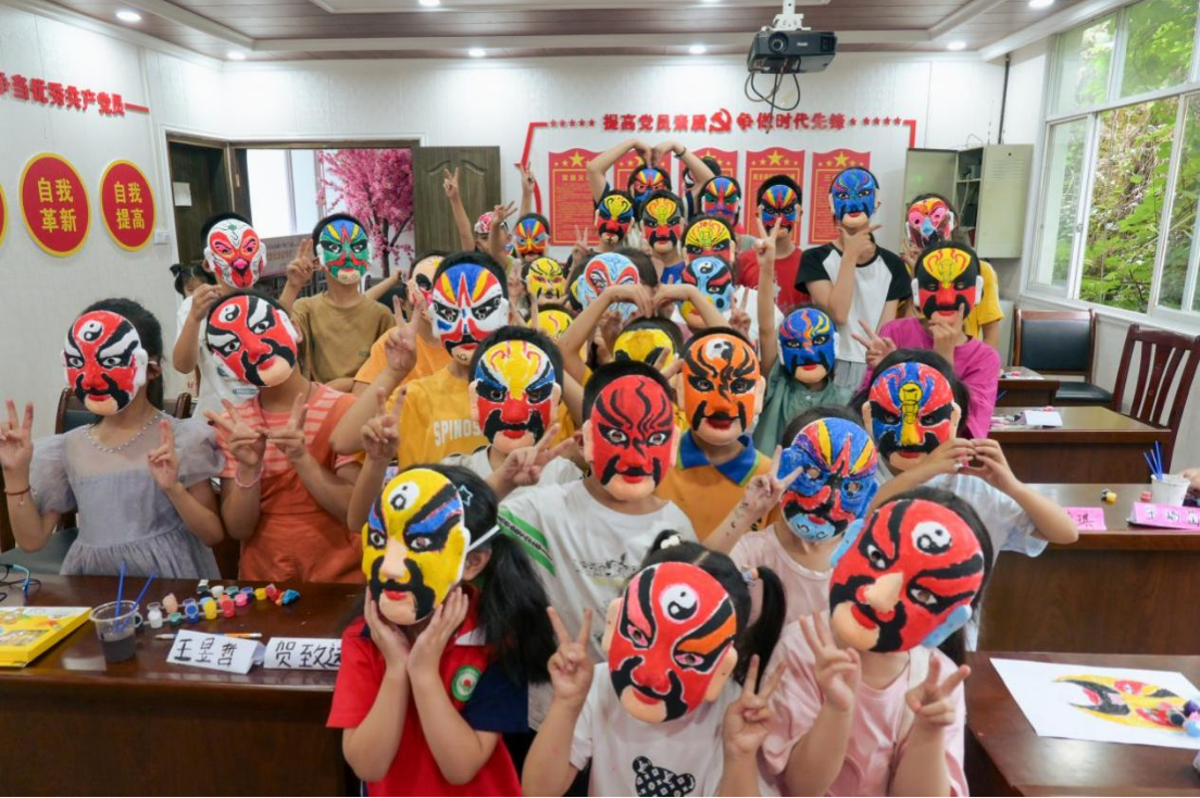 孩子们戴上自己绘制的脸谱开心的合影留念