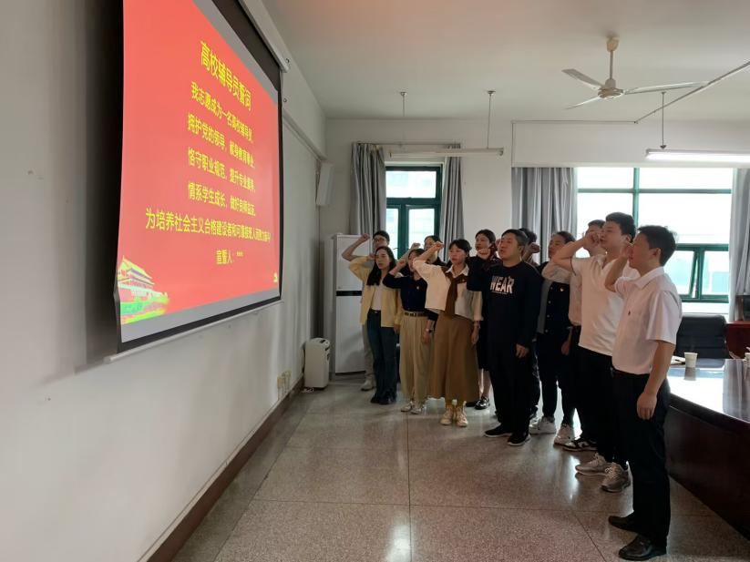 “我志愿成为一名高校辅导员……”,全体新进辅导员在学工部副部长王维的带领下进行入职宣誓,誓言铮铮,表达了自己投身教育事业的决心和信心。