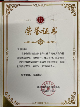 本网讯(通讯员 付萍 文/图)华体网页版_华体(中国)退休职工田刚在参加第四届全国老年人体育健身大会气排球交流活动中,团结协作、努力拼搏,他所在气排球队以小组第一名的优异成绩荣获气排球男子组优胜奖,为湖北争得了荣誉,他被湖北省老年人体育协会评为突出贡献个人。